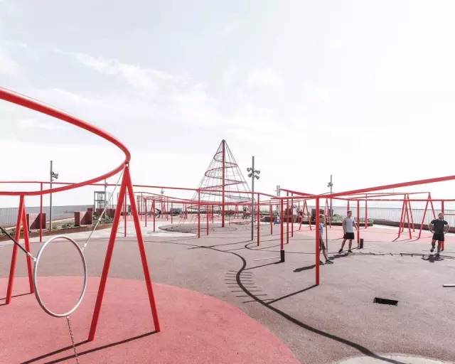 兩條巨型樓梯穿插其中,其上的鋼制扶手延綿而上,在屋頂轉(zhuǎn)化為秋千、攀爬架、單杠等等面向各個(gè)年齡階層的運(yùn)動(dòng)游樂(lè)設(shè)施,創(chuàng)造出一個(gè)活力十足的公共空間。