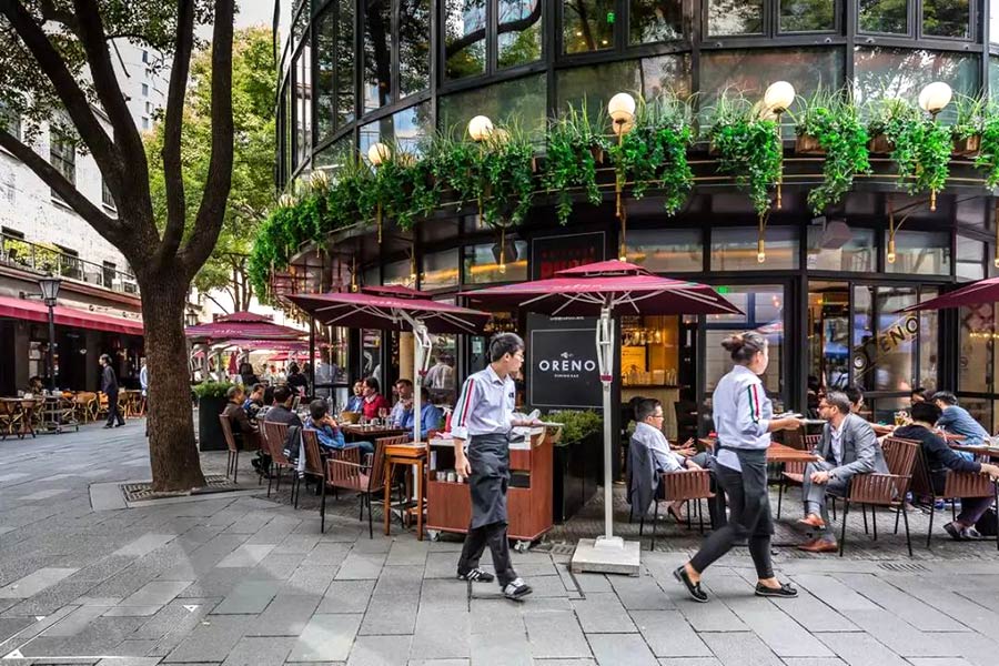 同樣地,景觀在商業(yè)街中的地位也不同凡響。上海美羅城五番街打造的是日系一條街,這里所有的景觀元素包括洗手間的地面鋪裝和層疊的小水缽,其實都是圍繞著日本“禪”的思想,打造靜謐的環(huán)境氛圍。