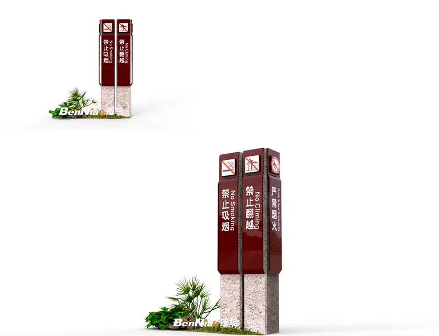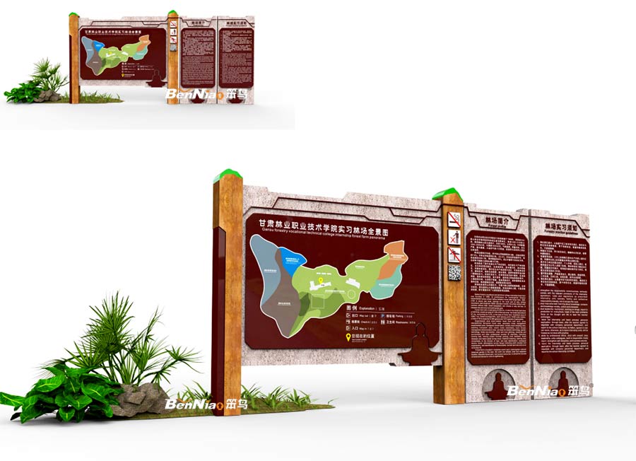 在材質(zhì)的運(yùn)用上,由于面對的是更具生態(tài)的戶外標(biāo)識,所以我們選用經(jīng)久耐用,以及防腐性更強(qiáng)的不銹鋼材質(zhì)在表面做仿石紋和仿木紋效果,結(jié)合旅游景區(qū)標(biāo)識牌標(biāo)準(zhǔn)顏色,使之更具符合項(xiàng)目環(huán)境,真正達(dá)到標(biāo)識與環(huán)境的融合,協(xié)調(diào)和統(tǒng)一。