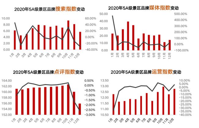 從景區(qū)細(xì)分維度走勢來看,5A級景區(qū)年度媒體指數(shù)變動較大,頭部景區(qū)各項指數(shù)全年運(yùn)行較為平穩(wěn),波動不大。其中故宮博物院、頤和園、拉薩布達(dá)拉宮景區(qū)、麗江古城景區(qū)、晉中平遙古城景區(qū)位列5A景區(qū)品牌TOP5。2020年國內(nèi)4A級景區(qū)媒體指數(shù)變動依然不小,同品牌指數(shù)變化趨勢相同,其他三個指數(shù)則表現(xiàn)相對平穩(wěn),其中壺口瀑布、陜西歷史博物館、中山共有、京杭大運(yùn)河、西江干戶苗寨位列年度4A級景區(qū)品牌TOP5。
