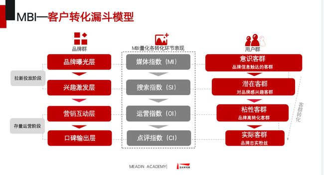 在演講開始,羅欽介紹了邁點指數(shù),即MBI品牌指數(shù)的運(yùn)作邏輯。邁點品牌指數(shù)MBI(Meadin Brand Index)是由邁點研究院自主開發(fā)并獨(dú)家發(fā)布的,用以反應(yīng)一段時期內(nèi)品牌在互聯(lián)網(wǎng)和移動互聯(lián)網(wǎng)影響力的指標(biāo)數(shù)據(jù),其評估了一個品牌在客群轉(zhuǎn)化的各個環(huán)節(jié)的實力表現(xiàn),用數(shù)據(jù)量化品牌實力。