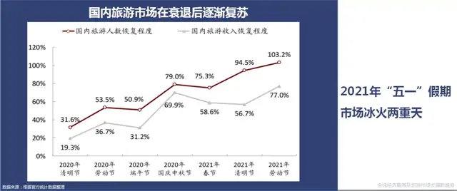 以2021年勞動節(jié)為例,國內(nèi)旅游人次恢復到2019年的103%,收入恢復到77%。國內(nèi)旅游市場雖然有所復蘇,但它是復雜的,因為疫情下旅游市場體現(xiàn)出冰火兩重天的情況。