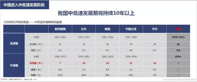 如(上)圖,聯(lián)邦德國、日本、韓國和中國臺灣地區(qū)在高速發(fā)展時期GDP平均增速是8.3%,平均持續(xù)時間是28年,中國1979—2013年處于高速增長期,GDP平均增速是9.8%,持續(xù)時間是36年。