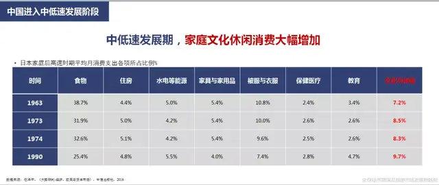 以日本為例,首先在中低速發(fā)展期,家庭文化休閑消費會大幅增加。日本在1963年高速期文化與休閑消費占到家庭消費每月支出7.2%, 1990年當日本進入中低速發(fā)展的時期,文化與休閑消費占到家庭消費每月支出已經(jīng)增長到9.7%。這跟中國有什么關系?