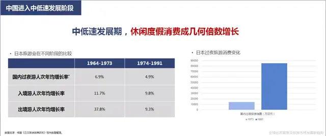 而在這期間,日本旅游業(yè)發(fā)生了什么變化?在低速期,日本過夜旅游人次也就是休閑度假的消費,雖然人次增速降低了,但是根據(jù)《日本旅游政策白皮書》數(shù)據(jù)顯示,日本過夜旅游總消費在1973年低速期和1990年高速期差距是5.89倍,中低速期休閑度假消費成幾何倍數(shù)增長。