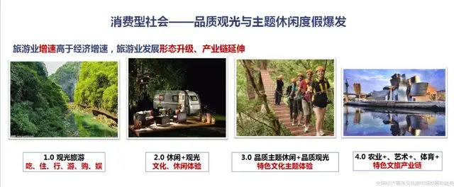 第一階段,是剛剛開放的旅游市場以觀光旅游為主,包括吃、住、行、游、購、娛六要素,第二階段,包括都市休閑、鄉(xiāng)村微度假和觀光產(chǎn)品文化休閑體驗,第三階段,是品質(zhì)休閑消費和品質(zhì)觀光旅游,主打特色文化主題體驗,是目前正在轉型的階段,第四階段,是泛文旅+和產(chǎn)業(yè)鏈的協(xié)同發(fā)展。