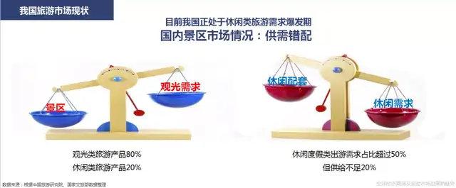 根據(jù)官方數(shù)據(jù)整理,國內(nèi)有超過80%景區(qū)是觀光型景區(qū),休閑度假景區(qū)占比僅為20%左右。但是根據(jù)中國旅游研究院統(tǒng)計數(shù)據(jù)顯示,占比超過50%的出行需求為休閑度假需求,其與占比20%的休閑類旅游產(chǎn)品形成了非常嚴重的供需錯配。