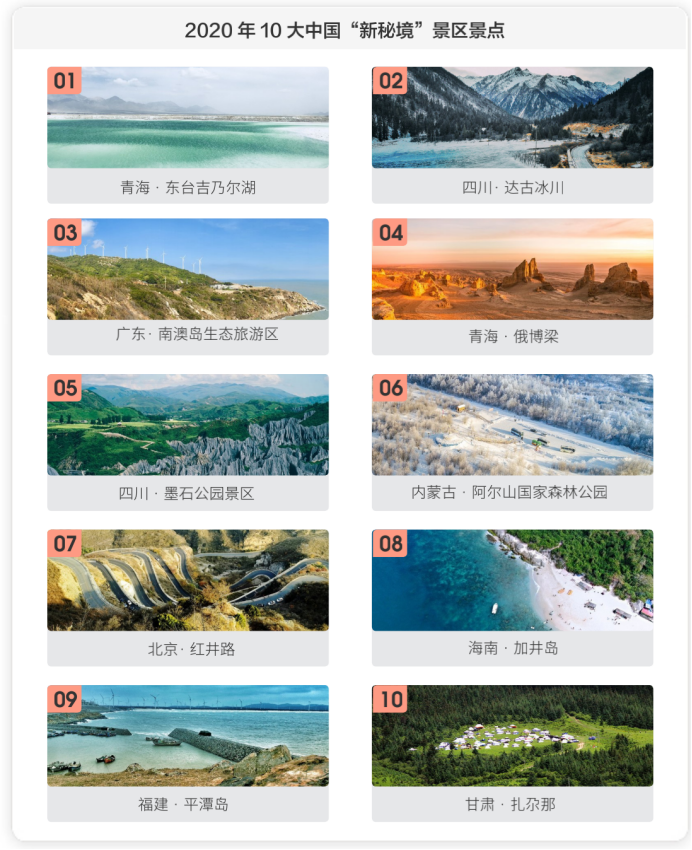 馬蜂窩旅游報告顯示,青海的東臺吉乃爾湖,四川的達(dá)古冰川,廣東汕頭的南澳島生態(tài)旅游區(qū)登陸2020年10大中國“新秘境”榜單前三甲。
