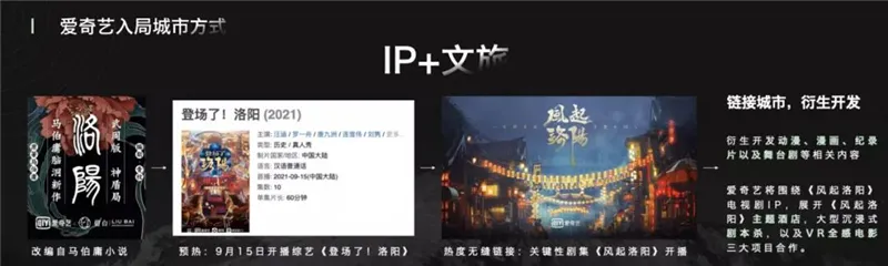 城市的不同文化內(nèi)核,是IP開發(fā)最富饒的土壤。河南通過河南奇妙游,驚艷地表現(xiàn)中國文化、河南地域文化,完成在地文化IP的開發(fā)的前半場。開發(fā)的下半場,則是線下形成旅游的體驗(yàn)轉(zhuǎn)化,如今,許多互聯(lián)網(wǎng)平臺(tái)紛紛入局城市,如愛奇藝通過IP+文旅,打造洛邑古城《風(fēng)起洛陽》“影視IP”文旅綜合項(xiàng)目,通過《風(fēng)起洛陽》核心劇集,衍生開發(fā)線上綜藝、漫畫、劇本殺、主題酒店等項(xiàng)目。