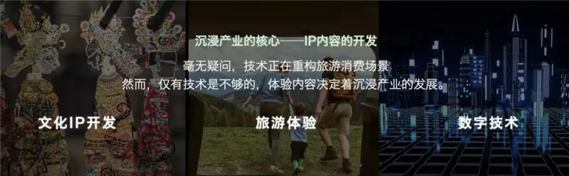 沉浸背后,技術(shù)正在重構(gòu)旅游消費(fèi)場景。然而,僅有技術(shù)是不夠的,體驗(yàn)的方式可以不斷更新,體驗(yàn)的內(nèi)容決定著沉浸產(chǎn)業(yè)的發(fā)展。文化IP開發(fā)+ 旅游體驗(yàn)+ 數(shù)字技術(shù)的三合一中,文化IP開發(fā)是核心。