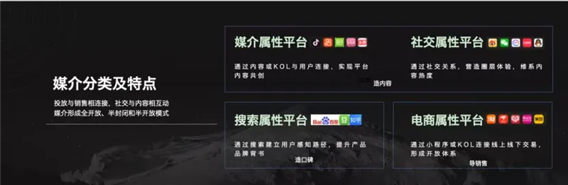 如今,不同的互聯(lián)網(wǎng)平臺(tái)有不同的特性,第一,以媒體屬性為代表的平臺(tái):通過內(nèi)容或KOL與用戶連接,實(shí)現(xiàn)平臺(tái)內(nèi)容共創(chuàng)。第二,以社交屬性類平臺(tái):通過社交關(guān)系,營造圈層體驗(yàn),維系內(nèi)容熱度。第三,搜索屬性平臺(tái):通過搜索建立用戶感知路徑,提升產(chǎn)品品牌背書。第四,電商屬性平臺(tái):通過小程序或KOL連接線上線下交易,形成開放體系。