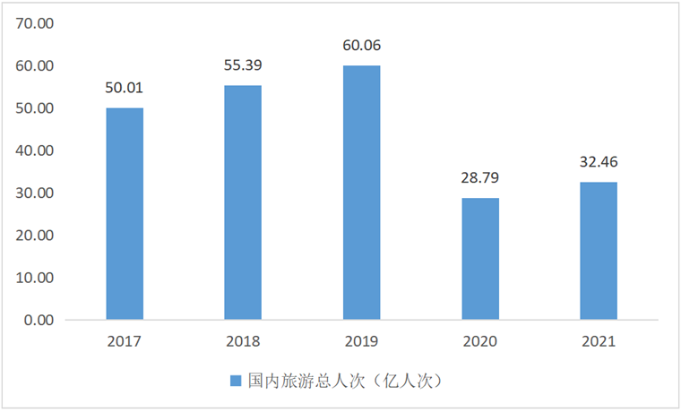 圖1 2017-2021年國(guó)內(nèi)游客人次變化情況(單位:億人次)