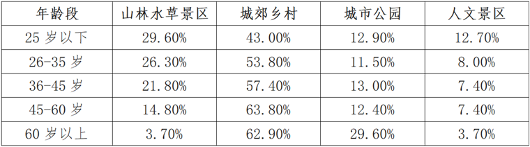 從游覽區(qū)域看,游客年齡與城郊鄉(xiāng)村的需求成正相關(guān),與對(duì)山林水草景區(qū)和人文景區(qū)的需求成負(fù)相關(guān)。高收入群體對(duì)人文景觀和山林水草自然觀光景區(qū)的需求更高。親子旅游、研學(xué)旅游需求集中釋放,45歲以下的游客更喜歡和家人一起出游,比例高達(dá)四成左右。