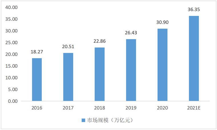 圖4 2016-2021年我國(guó)夜間旅游市場(chǎng)規(guī)模及預(yù)測(cè)(單位:萬(wàn)億元)