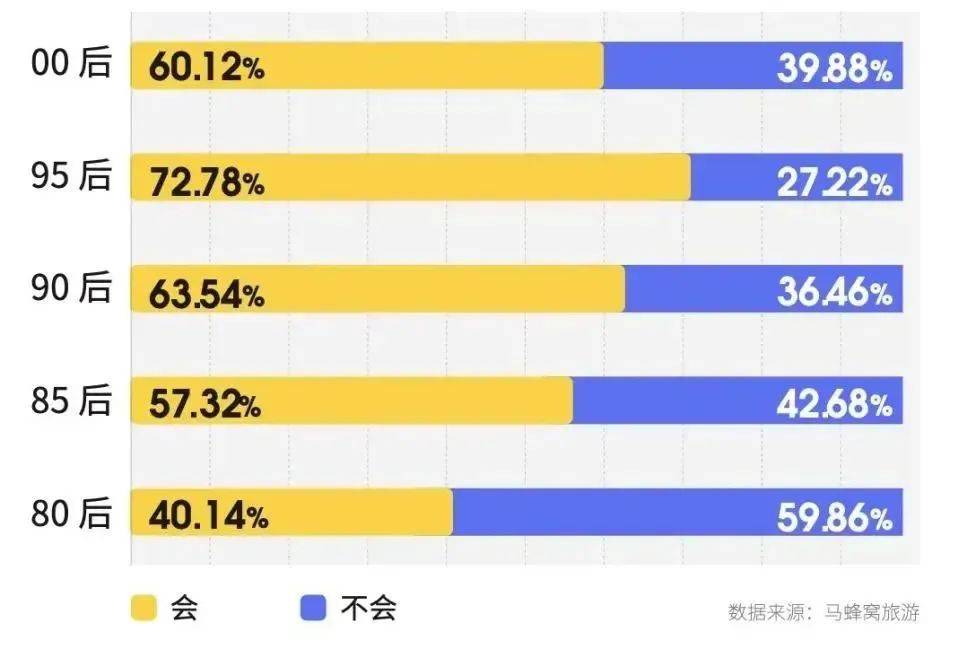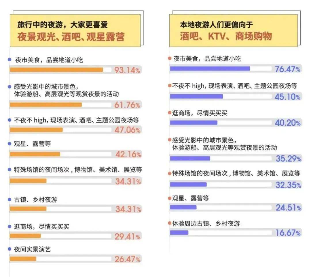 報告顯示,年輕人群的夜游參與度最高,72.78%的95后游客表示會在旅行中專門策劃夜晚游玩的行程。90后和00后游客專程體驗夜生活的人群占比也分別達(dá)到63.54%和60.12%?!耙褂魏?、“夜游西湖”、“珠江夜游”等攻略一直深受年輕游客歡迎,關(guān)注度高居不下。