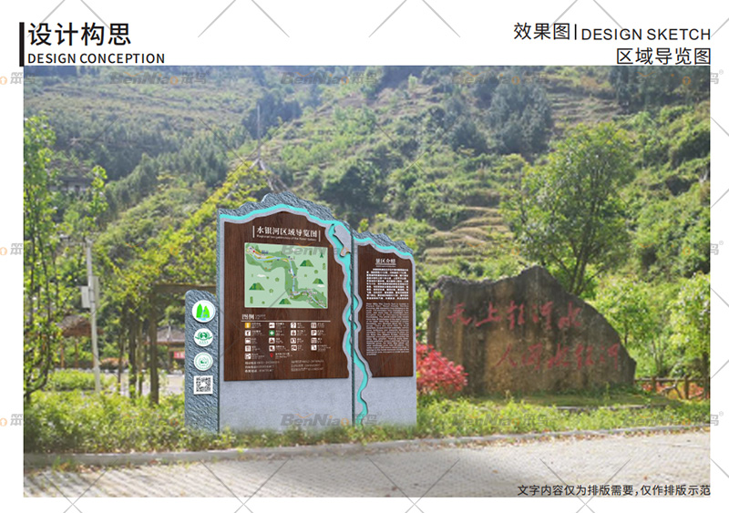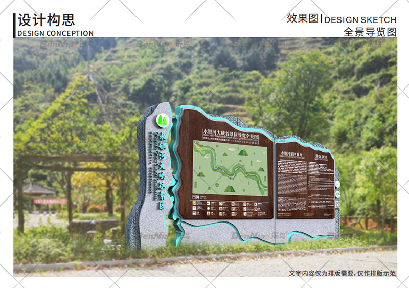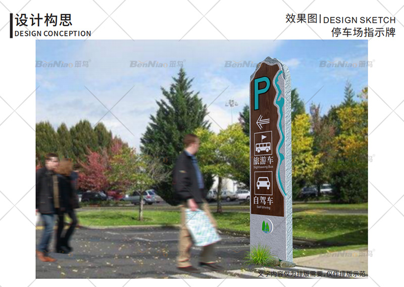 導(dǎo)視牌造型形體尺寸設(shè)置,根據(jù)景區(qū)環(huán)境、景區(qū)建筑以及游客的瀏覽角度確定,尺寸需要符合相關(guān)部分的設(shè)計規(guī)范。導(dǎo)視牌的尺寸既要顯眼、容易觀察,也要注意不能遮擋游客的視線范圍,影響景點的環(huán)境布局。