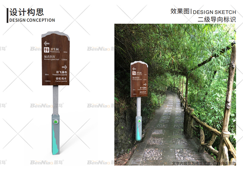 景區(qū)導(dǎo)視系統(tǒng)是在風景旅游景區(qū)中為游客傳遞路線,指明景點位置,起安全警示作用及傳達景區(qū)發(fā)展理念的標識牌或標識物,包括景觀點名牌、說明牌、安全警示牌、道路引導(dǎo)牌、宣傳牌等,是風景旅游區(qū)重要的旅游服務(wù)設(shè)施系統(tǒng)。而且好的導(dǎo)視系統(tǒng)設(shè)計制作,不僅能為旅客提供必要的道路指引,本身也可成為景區(qū)的一景。