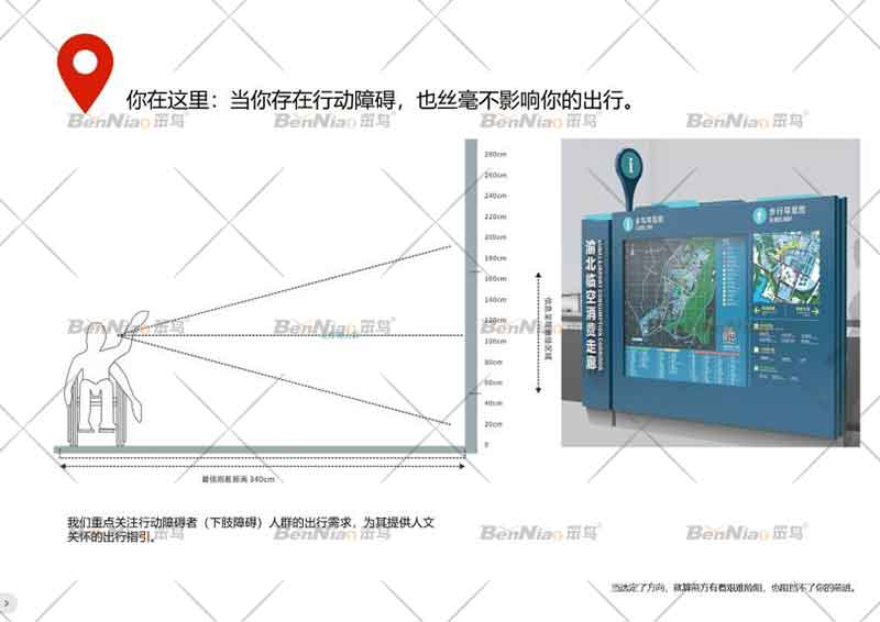 人性化的設(shè)施服務(wù)是一個城市有序運(yùn)轉(zhuǎn)不可或缺的強(qiáng)大工具。人與城市之間的溝通,最為主要的聯(lián)接載體之一,就體現(xiàn)在城市導(dǎo)視系統(tǒng)上,根據(jù)人群分布和流動特點(diǎn)進(jìn)行合理設(shè)置導(dǎo)視牌的尺度與位置,只有這樣才能達(dá)到導(dǎo)視系統(tǒng)與人群行為模式的相配。運(yùn)用充滿關(guān)愛的通用設(shè)計,提升城市空間的公平性,以靈活的設(shè)置形式,多種類信息傳遞方式方便各類人群的使用。尺度的人機(jī)工程學(xué)考量也將滿足不同不同場景下的使用。