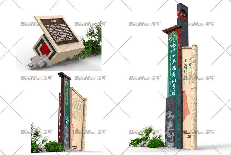 標識系統(tǒng)是結合環(huán)境與人之間的信息界面系統(tǒng),導視具有標志、信號、說明、指示等含義。旅游景區(qū)標識系統(tǒng)不僅起到景區(qū)景點的指引、介紹等作用,也是旅游景區(qū)形象名片和文化展示窗口,游客的每一次駐足,無形中都是對景區(qū)文化的一次識讀、記憶和審美感受。因此在旅游景區(qū)標識系統(tǒng)設計中要充分考慮文化元素的有機融入。