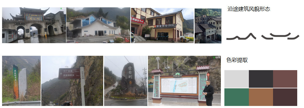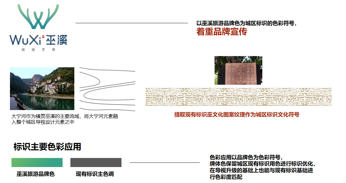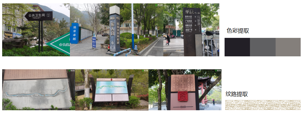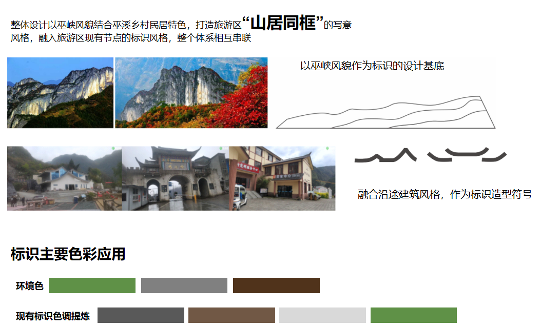 色彩分析:主色為黑、灰、棕,搭配色石材色、銅色及金屬做舊,可保留現(xiàn)狀色彩結(jié)合巫溪旅游品牌色進行標識升級