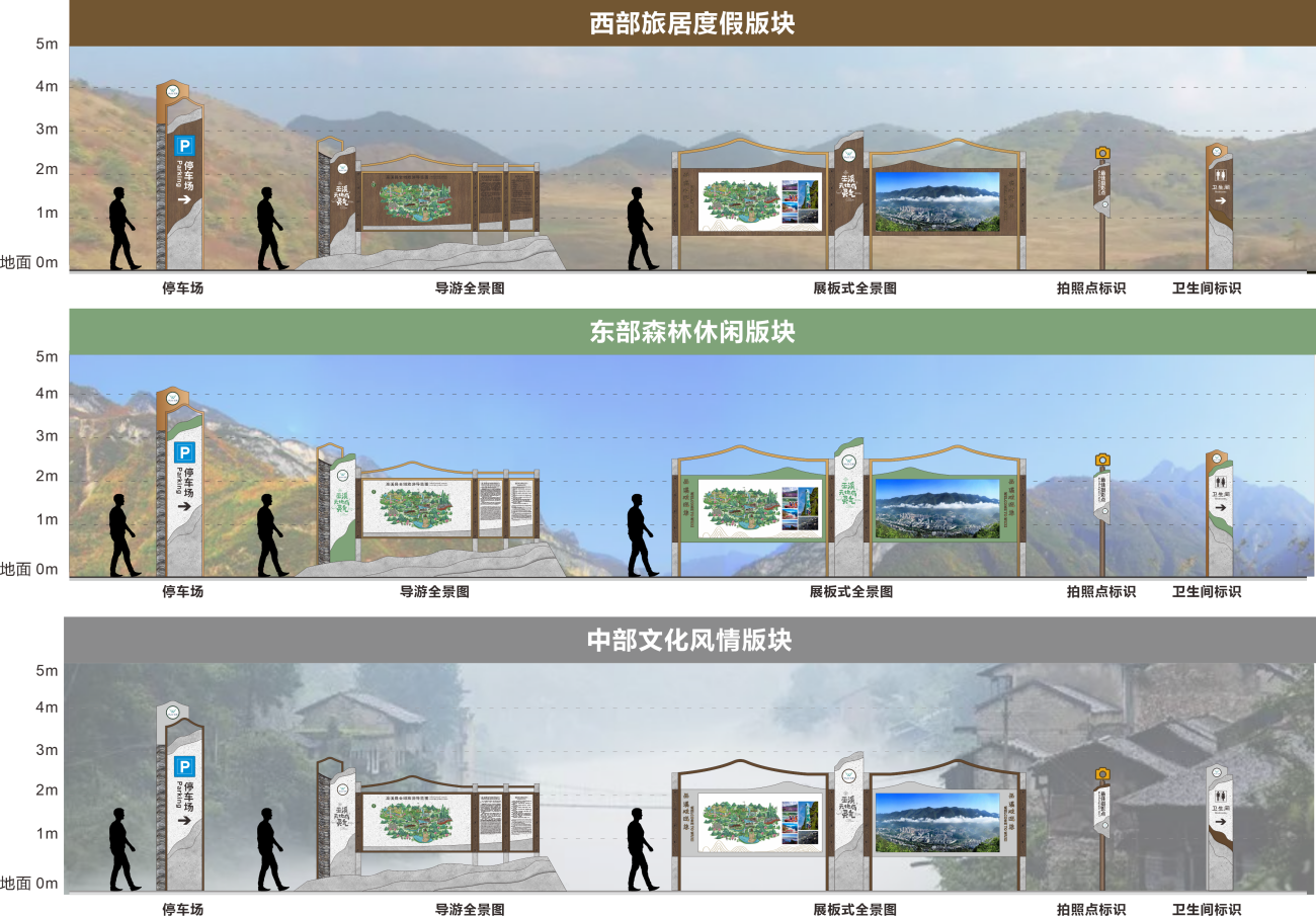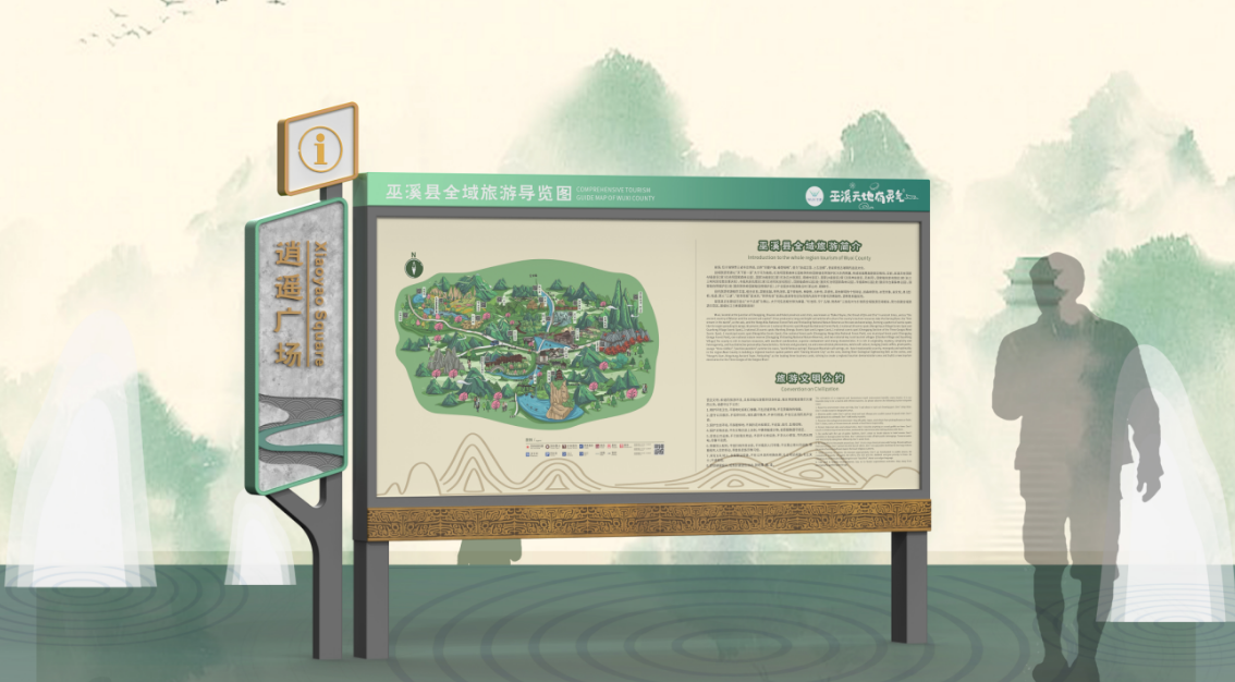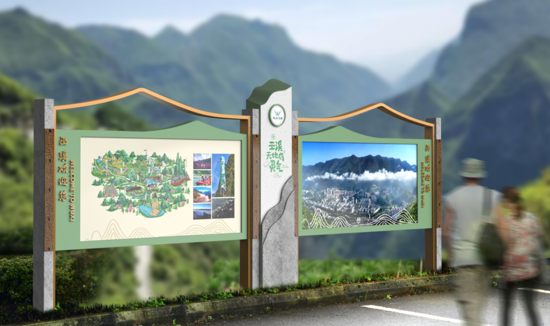 設計分析:自然風貌、巫溪民居特點、石材基底,風格寫意;缺點:各個節(jié)點標識現(xiàn)狀風格各異,需統(tǒng)一風格滿足全域旅游規(guī)范