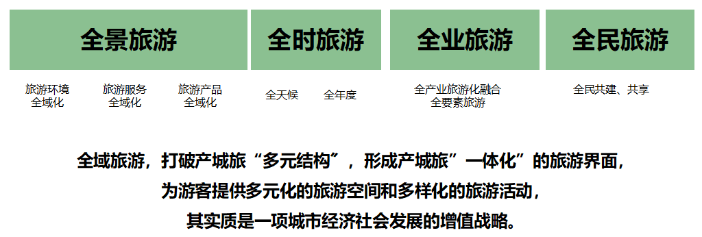 全域旅游,打破產(chǎn)城旅“多元結(jié)構”,形成產(chǎn)城旅”一體化”的旅游界面,為游客提供多元化的旅游空間和多樣化的旅游活動,其實質(zhì)是一項城市經(jīng)濟社會發(fā)展的增值戰(zhàn)略。