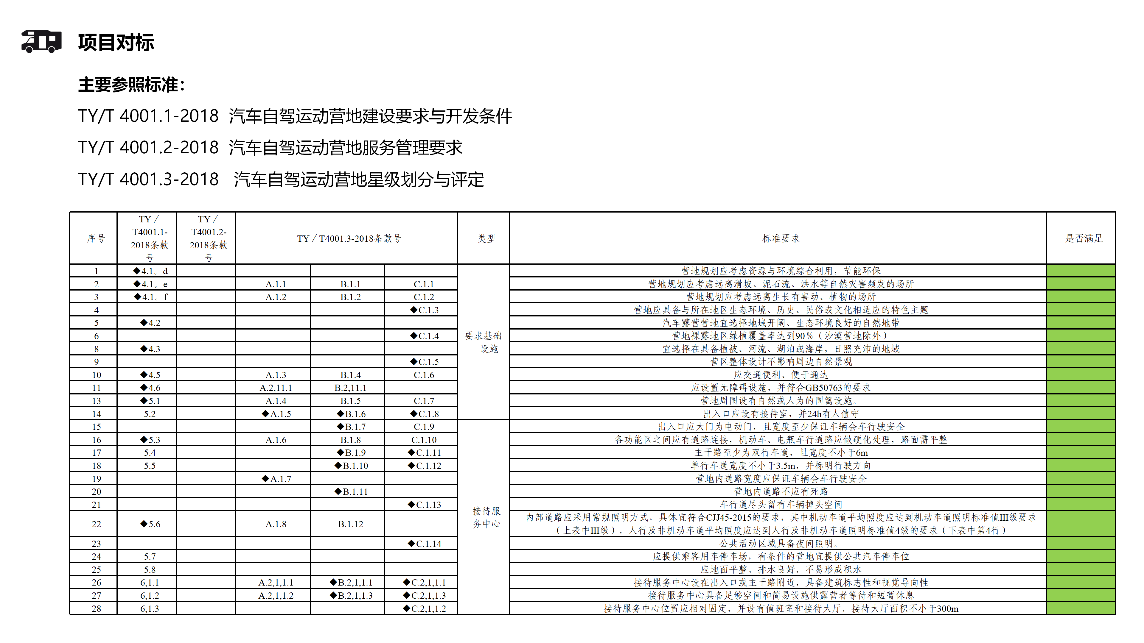 根據(jù)行業(yè)標(biāo)準(zhǔn),汽車自駕運(yùn)動(dòng)營(yíng)地的建設(shè)需要滿足一定的要求。其中,標(biāo)識(shí)系統(tǒng)需要具備系統(tǒng)性、規(guī)范性和實(shí)用性,以確保游客能夠方便地找到和使用各種設(shè)施。在實(shí)地調(diào)研的過(guò)程中,嚴(yán)格對(duì)標(biāo)行業(yè)標(biāo)準(zhǔn),查漏補(bǔ)缺。
