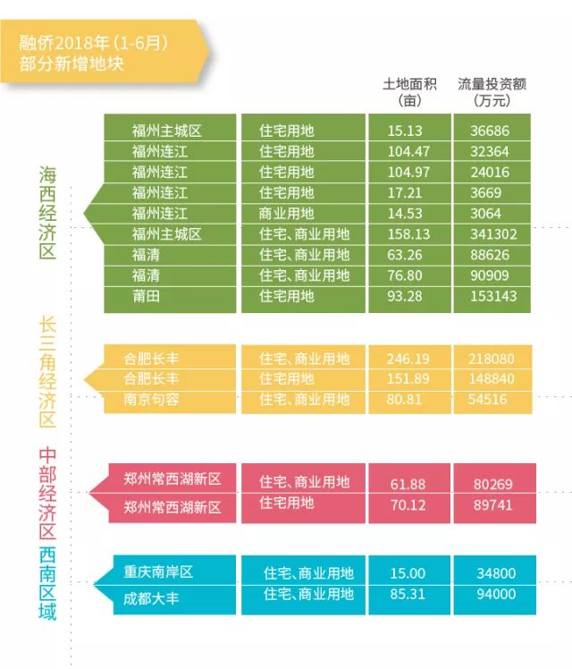 2018年上半年,融僑通過(guò)招拍掛、戰(zhàn)略合作、項(xiàng)目合作等方式,在重慶、成都、合肥、鄭州、南京、福州、莆田、福清等全國(guó)經(jīng)濟(jì)強(qiáng)市拓展了十余幅優(yōu)質(zhì)地塊,形成對(duì)全國(guó)熱點(diǎn)經(jīng)濟(jì)區(qū)的覆蓋:目前,融僑已穩(wěn)固深耕長(zhǎng)三角經(jīng)濟(jì)區(qū)、海西經(jīng)濟(jì)區(qū)、中部經(jīng)濟(jì)區(qū)、京津冀經(jīng)濟(jì)區(qū),力拓西南區(qū)域及華南區(qū)域。僅2018年前6個(gè)月,融僑全國(guó)新增土儲(chǔ)建面已超越2017年全年指標(biāo),未來(lái)2年內(nèi)全國(guó)可售貨值預(yù)估超1700億。