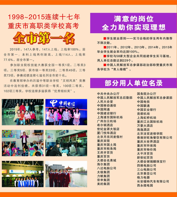 重慶市商務(wù)學(xué)校創(chuàng)辦于1957年,是重慶市大渡口區(qū)教育委員會(huì)直屬的國家級(jí)重點(diǎn)中等職業(yè)學(xué)校,是國家中等職業(yè)教育改革發(fā)展示范學(xué)校建設(shè)單位。