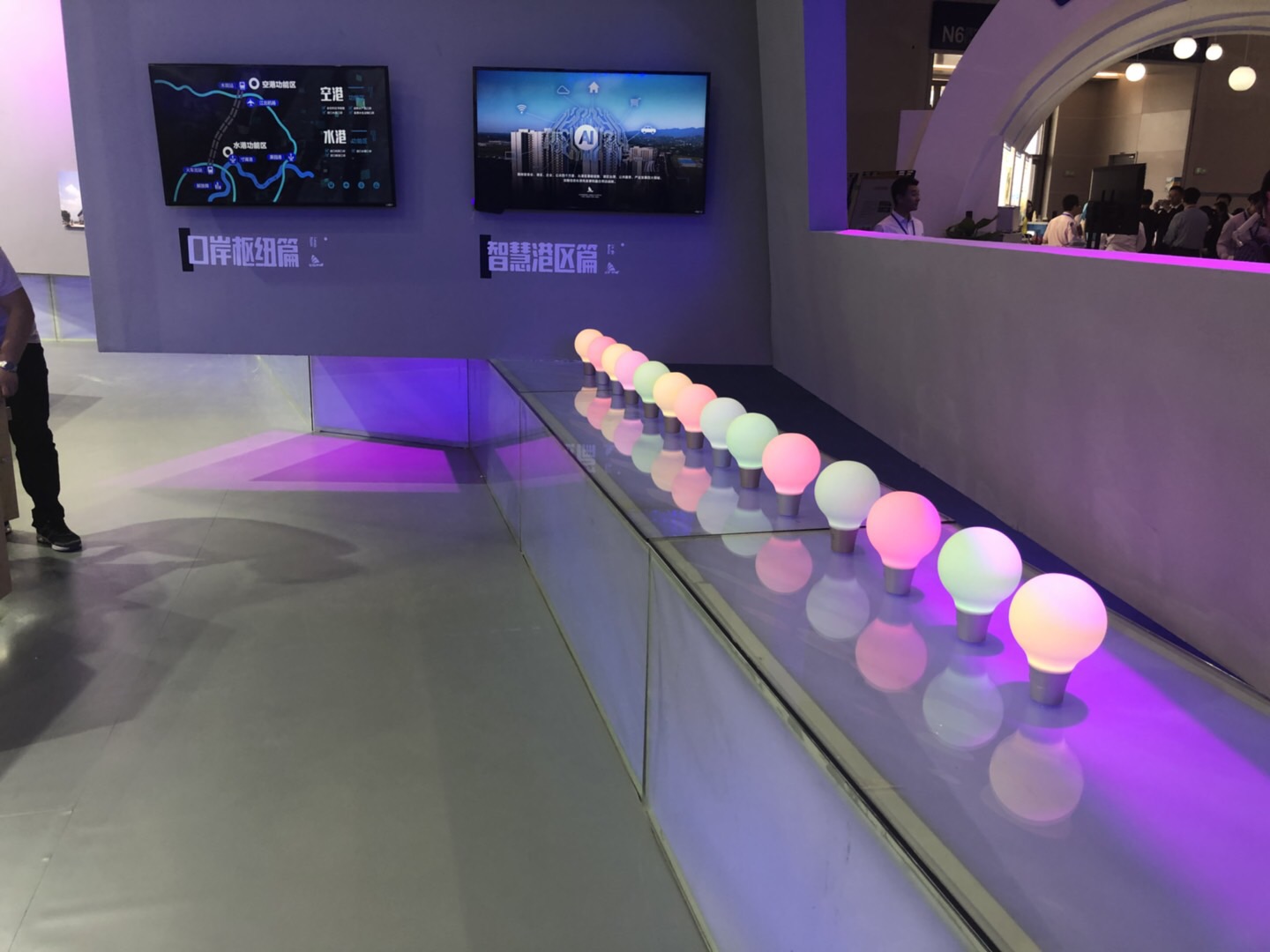 展臺(tái)將港區(qū)作為全國(guó)首個(gè)“水港+空港”一區(qū)雙核的特點(diǎn)抽象物化,以底部的燈箱代表水路航道,以飛機(jī)機(jī)身的銀色墻體代表飛行軌道。分綜合、口岸樞紐、加工貿(mào)易、服務(wù)貿(mào)易、現(xiàn)代物流、產(chǎn)城融合、智能港區(qū)七個(gè)主題,全面展現(xiàn)保稅港區(qū)產(chǎn)業(yè)十年來的建設(shè)歷程及所取得的成績(jī)。