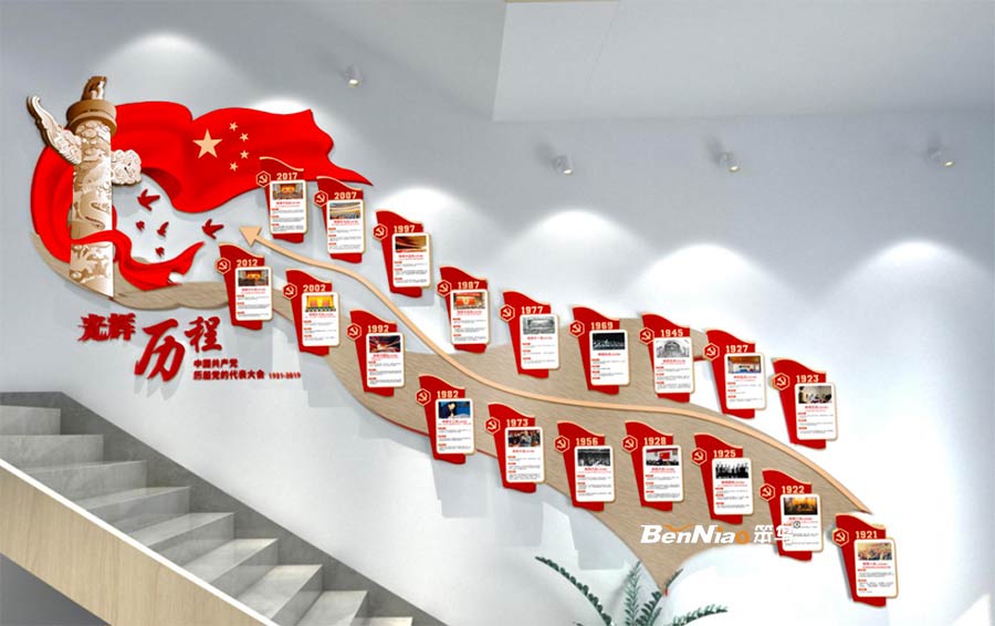 在黨員活動室等展廳,大部分會安裝黨徽樣式的發(fā)光字或其他標(biāo)識牌,但很多施工人員并不清楚黨徽安裝的正確方向,這里給大家說,首先要明白室內(nèi)空間正前方是哪個方向,一半以主席臺為前,如沒有主席臺就以宣誓墻作為前,仰視天花板,黨徽方向是正的方向。