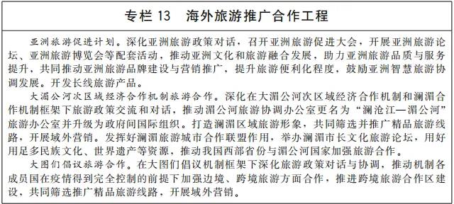 推進粵港澳大灣區(qū)旅游一體化發(fā)展,提升大灣區(qū)旅游業(yè)整體競爭力,打造世界級旅游目的地。深化港澳與內(nèi)地旅游業(yè)合作,創(chuàng)新粵港澳區(qū)域旅游合作協(xié)調(diào)機制,推動資源共享。支持香港旅游業(yè)繁榮發(fā)展,加強內(nèi)地與香港旅游業(yè)在客源互送、宣傳營銷等方面合作。支持香港發(fā)展中外文化藝術交流中心。推動澳門世界旅游休閑中心建設,支持澳門舉辦世界旅游經(jīng)濟論壇、國際旅游(產(chǎn)業(yè))博覽會等,打造以中華文化為主流、多元文化共存的交流合作基地。支持港澳青少年赴內(nèi)地進行游學交流活動。推進海峽兩岸鄉(xiāng)村旅游、旅游創(chuàng)意產(chǎn)品開發(fā)等領域合作,探索海峽兩岸旅游融合發(fā)展新路,讓旅游成為增進中華文化認同、增強中華民族凝聚力的有效途徑。