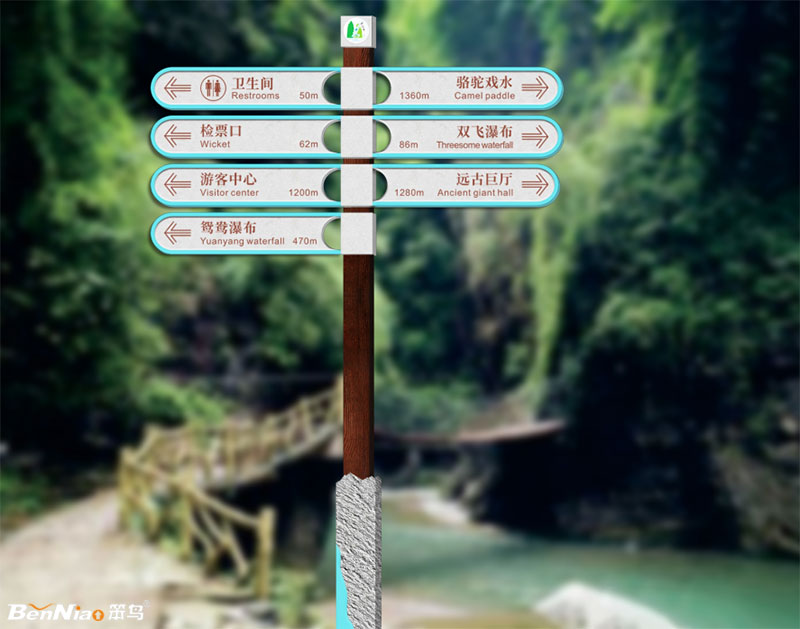 3、單柱式:該類旅游景區(qū)標(biāo)識(shí)的構(gòu)造簡單,設(shè)定場地一般挑選狹小的旅途,它一般設(shè)定在2個(gè)或好幾個(gè)空間彼此之間轉(zhuǎn)換或交叉的本地。一般做為交通出行導(dǎo)向性標(biāo)識(shí)牌來應(yīng)用,柱頭上能夠一起設(shè)定總數(shù)較多的標(biāo)識(shí)牌,傳遞很多的標(biāo)示信息和相對(duì)應(yīng)的標(biāo)示方位,那樣就能讓游客在沒有了解的空間中迅速,很快地得到信息。