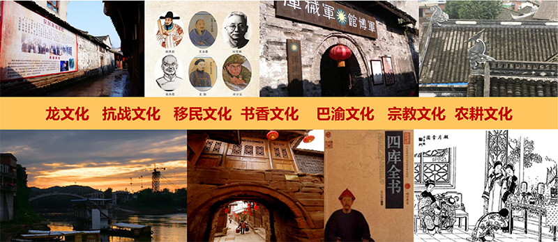 我們以安居古城千年文化積淀和歷史傳承最具代表性的承載物為主要文化展示意向,九宮十八廟、科甲坊、曾氏宗祠、瓊江書院、銅梁龍燈展廳等,將廟宇文化、才子文化、龍文化、市井文化和抗戰(zhàn)文化進(jìn)行有機(jī)融合。