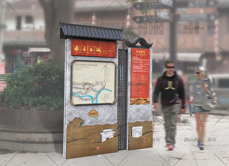 標(biāo)識系統(tǒng)規(guī)劃是根據(jù)景區(qū)的可行性分析報(bào)告、規(guī)劃設(shè)計(jì)圖紙來進(jìn)行標(biāo)識系統(tǒng)的總體規(guī)劃,當(dāng)我們對安居古城整個(gè)景區(qū)熟知后確定了標(biāo)識牌數(shù)量、標(biāo)識牌體量大小、標(biāo)識牌所處的地域結(jié)構(gòu),進(jìn)行了嚴(yán)格周密的規(guī)劃??傮w而言,在規(guī)劃布局上則要做到導(dǎo)視明確、層級清晰、位置醒目、分布合理。