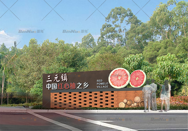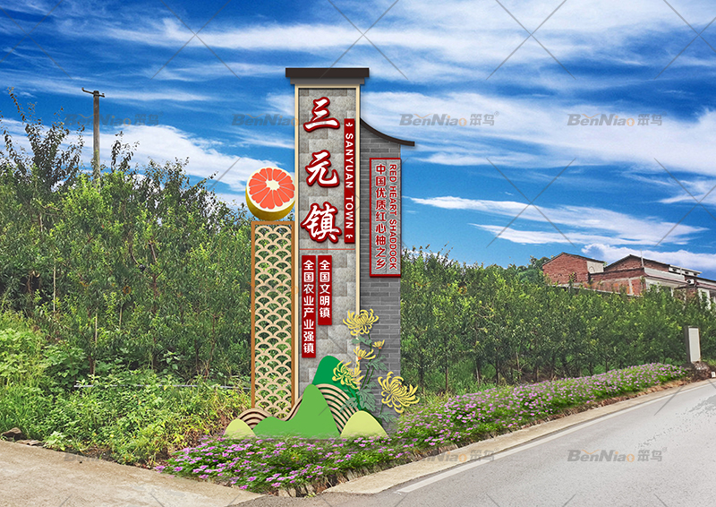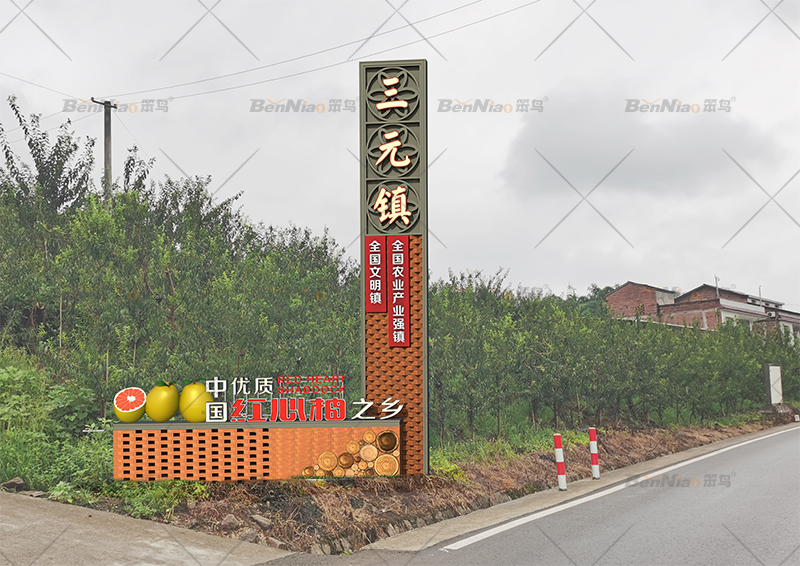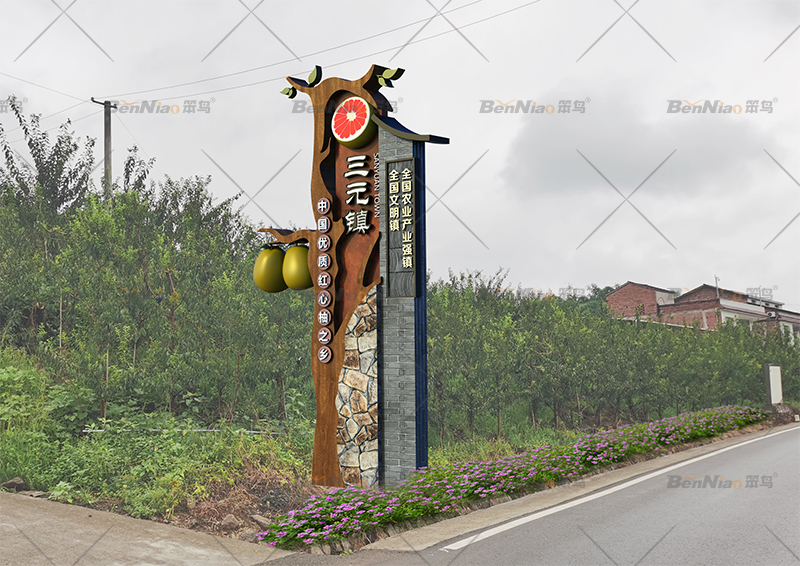近年來,各種美麗的鄉(xiāng)村越來越多,美麗鄉(xiāng)村標識牌作為鄉(xiāng)村的規(guī)劃和建設的一部分,也顯得越來越重要。“主題形象標識”是標識牌的一種形式,是形象,標志,理念等表達傳播的一種具象化展示形式。笨鳥為豐都縣三元鎮(zhèn)設計制作的形象標識,詮釋了三元鎮(zhèn)的發(fā)展理念,提升鎮(zhèn)區(qū)品位。寓意以產業(yè)為依托振興鄉(xiāng)村經濟發(fā)展。
