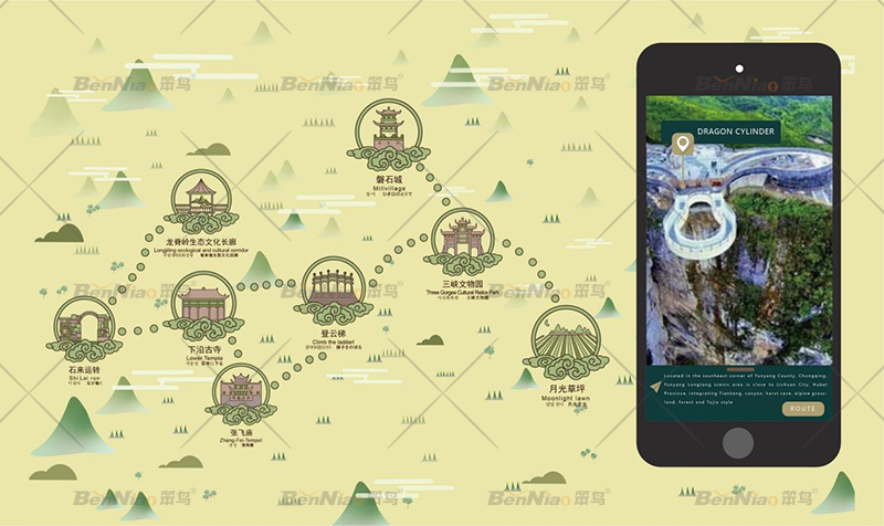 將手繪地圖運用在導(dǎo)視系統(tǒng)中,景區(qū)完整呈現(xiàn)在游客面前,讓游客對云陽縣景區(qū)全貌一覽便知,極大的方便了游客對于參觀路線的選擇,了解整座城市的旅游景點,人文歷史,為推動云陽縣旅游發(fā)展奠定基礎(chǔ)。