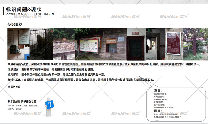 項目研究:為了更好的契合張飛廟景區(qū)導視需求,在項目開展的初期,對于研究范圍內的用地和導視功能現(xiàn)狀進行了詳細的實地調研。過程中發(fā)現(xiàn)了諸多的問題,經(jīng)過總結整理出以下幾項內容:現(xiàn)狀各級標識功能混亂,不成體系,無法滿足各級標識對應的信息識別需求?,F(xiàn)狀標識形象混亂,缺乏統(tǒng)一風格,標識信息不規(guī)范等。