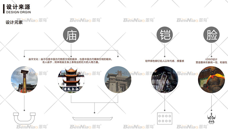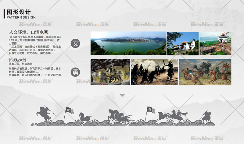 在張飛廟景區(qū)導視設計元素中,抓取蜀漢三國張飛歷史、金戈鐵馬以及具有1700多年的廟宇文化作為整個設計的主要視覺元素進行提煉,對于景區(qū)和商業(yè)區(qū)空間以整體風格統(tǒng)一,局部區(qū)分展示。