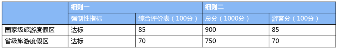 旅游度假區(qū)的等級(jí)劃分細(xì)則分為兩部分。《細(xì)則一》用于旅游度假區(qū)基礎(chǔ)評(píng)價(jià),內(nèi)容包括強(qiáng)制性指標(biāo)、資源環(huán)境與度假產(chǎn)品綜合評(píng)價(jià)?!都?xì)則二》用于旅游度假區(qū)現(xiàn)場(chǎng)檢查,對(duì)旅游度假區(qū)進(jìn)行區(qū)位與區(qū)域基礎(chǔ)、環(huán)境與度假資源、功能與度假產(chǎn)品、配套設(shè)施與服務(wù)、市場(chǎng)結(jié)構(gòu)與形象、管理與服務(wù)品質(zhì)的綜合評(píng)價(jià)。