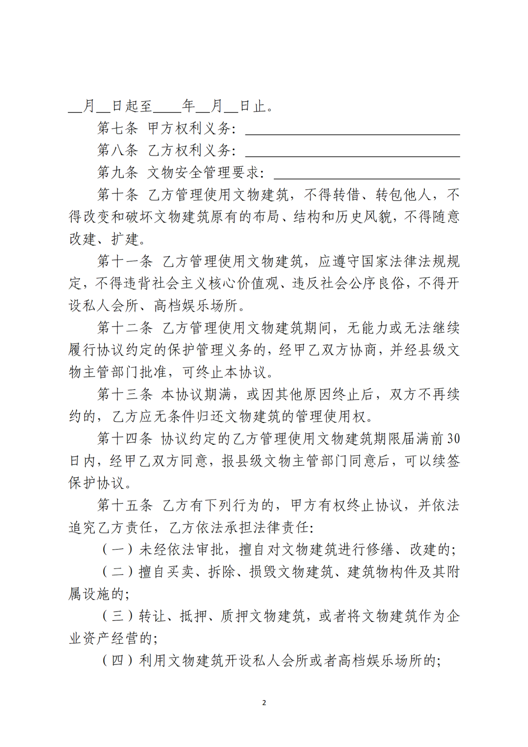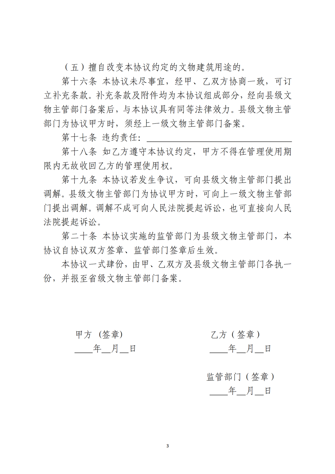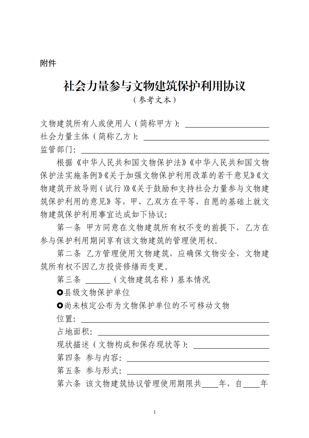 省級(jí)文物主管部門(mén)可參照社會(huì)力量參與文物建筑保護(hù)利用協(xié)議參考文本(附后),結(jié)合本地實(shí)際,制定社會(huì)力量參與文物建筑保護(hù)利用協(xié)議文本。按照“一處一策”原則,文物建筑所有人或使用人與確定的社會(huì)力量主體簽訂保護(hù)利用協(xié)議,明確保護(hù)利用要求、各方權(quán)利義務(wù)和違約責(zé)任等內(nèi)容。沒(méi)有明確使用人的國(guó)有文物建筑可由縣級(jí)文物主管部門(mén)與社會(huì)力量主體簽訂保護(hù)利用協(xié)議。協(xié)議簽訂后,應(yīng)報(bào)至省級(jí)文物主管部門(mén)備案。