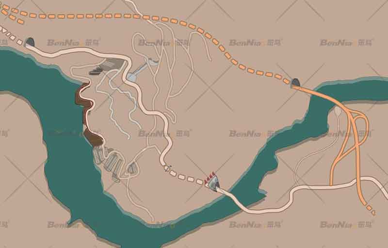 根據(jù)重慶烏江·龔灘旅游度假區(qū)實(shí)際情況,對(duì)各類地形地貌進(jìn)行繪制,如山丘、河流、湖泊、樹林等。由于重慶烏江·龔灘旅游度假區(qū)歷史文化氣息濃厚,以灰色和墨綠色為主要色調(diào),整體畫面風(fēng)格大氣古樸,這一因素也較大程度的決定了手繪地圖的風(fēng)格。