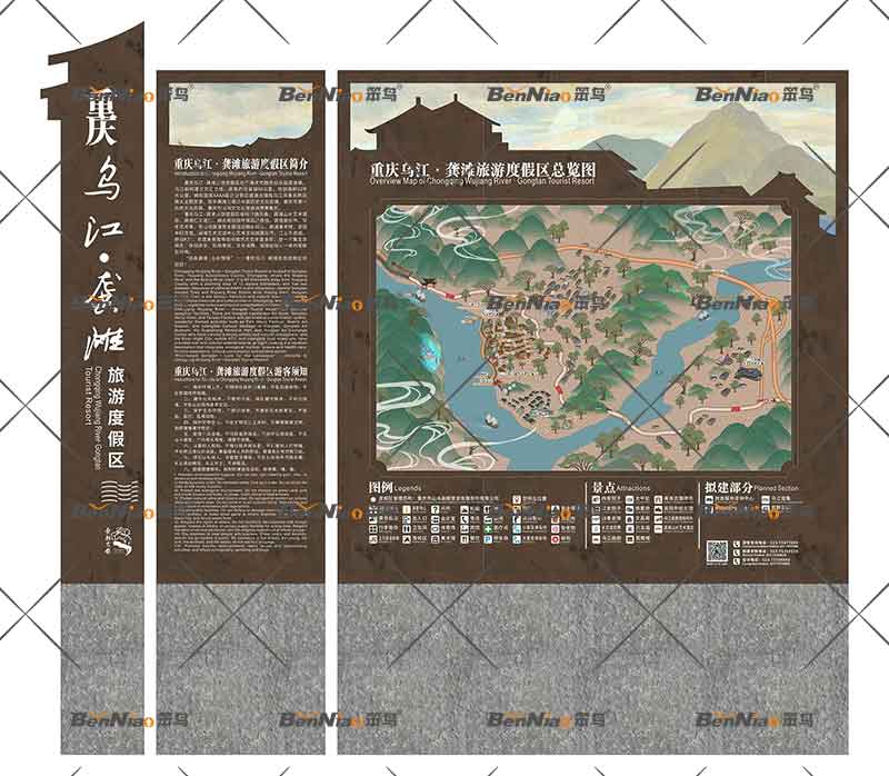 圖面內(nèi)容繪制完成后,需要進(jìn)行圖面整體設(shè)計(jì)排版,考慮顏色設(shè)計(jì)分布合理和整體布局平衡協(xié)調(diào),對(duì)標(biāo)記和周邊的介紹性文字進(jìn)行合理排版,讓文字與主題風(fēng)格相結(jié)合,主題內(nèi)容突出、層次感分明、虛實(shí)有度,美觀整潔,這就是我們?yōu)橹貞c烏江·龔灘旅游度假區(qū)完成的手繪地圖最終成果。