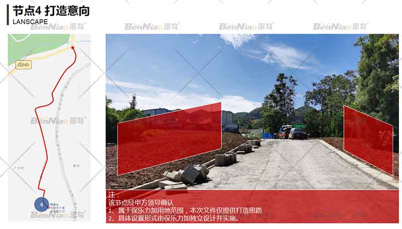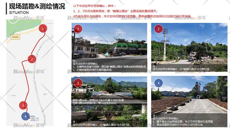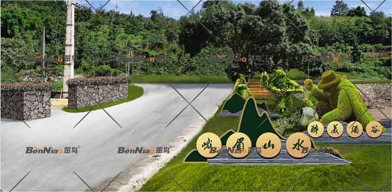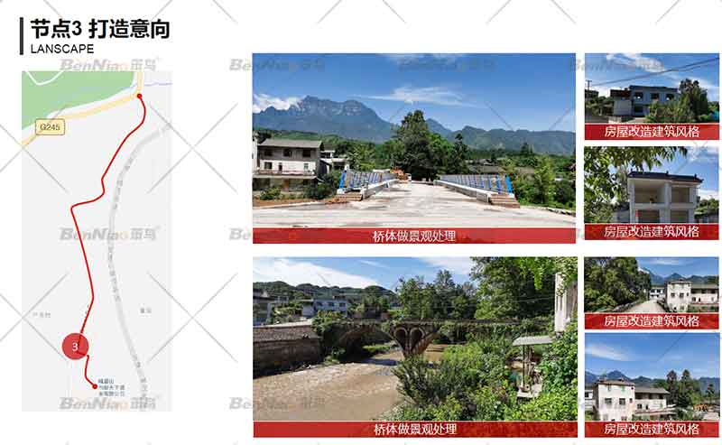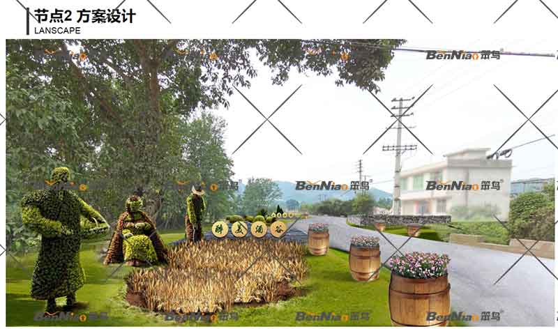 節(jié)點二、結合現(xiàn)狀大樹以“峨眉山水.醉美酒谷”為主題宣傳語,融入文化、綠化設計和建筑景觀與周圍的自然環(huán)境和人文環(huán)境兼容,同時加強生態(tài)保護,真正做到“路景相融、路生美景、人車路和諧”。提取山水、麥田裝置、農作人物雕塑、橡木酒桶等要素體現(xiàn)峨眉酒谷主題氛圍。