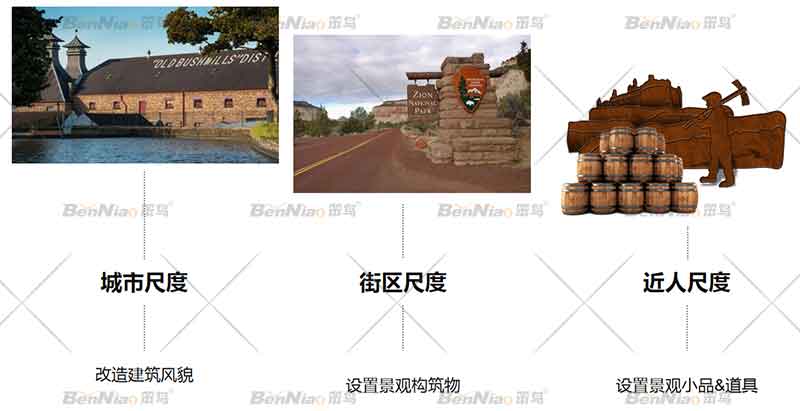 以品牌宣介為主旨,結合實地現(xiàn)場踏勘情況我們從城市尺度、街區(qū)尺度、近人尺度三個方面著手確定了項目通景公路沿線景觀節(jié)點打造方式。