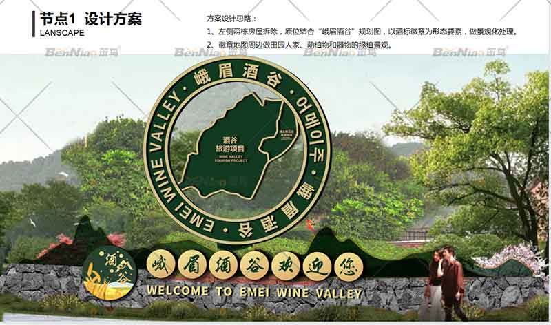 節(jié)點一、在設計時根據(jù)道路資源的特征,合理布點,將它們串連成線,使景觀的點、線、面有機結合。我們結合峨眉酒谷規(guī)劃圖,以酒標徽章為形態(tài)要素,設置主題入口形象。