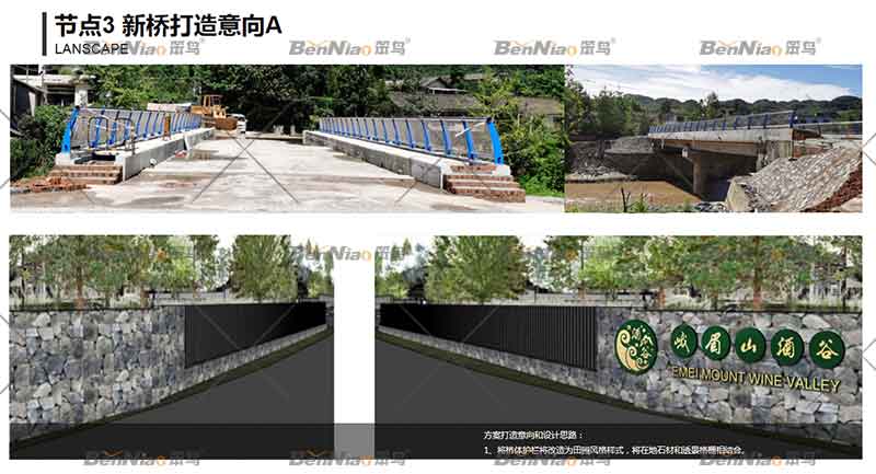 節(jié)點三、對現(xiàn)有交通橋進行改造,以疊川麥芽威士忌酒廠建筑風貌為藍本,石墻、格柵,結合峨眉酒谷品牌logo重點呈現(xiàn)。