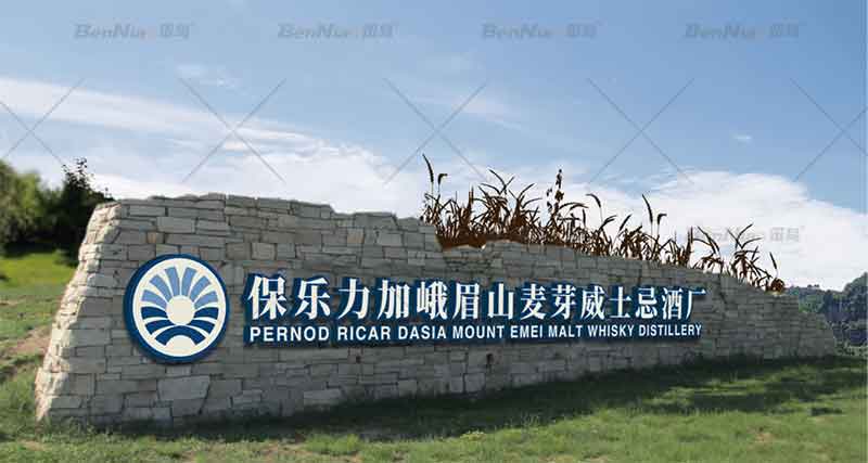 方案一提取酒廠建筑構筑要素以原石為基礎形成LOGO景觀墻,結合釀酒作物大麥雕塑,展現(xiàn)保樂力加品牌和釀酒特點。