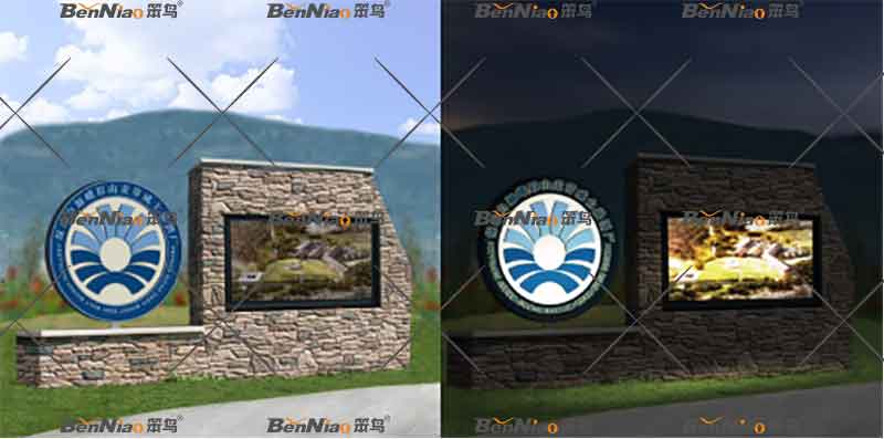 方案二以酒廠logo為主要呈現(xiàn)內容,文化石墻結合電子屏(可用于節(jié)慶活動、動態(tài)播放酒廠相關信息)