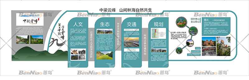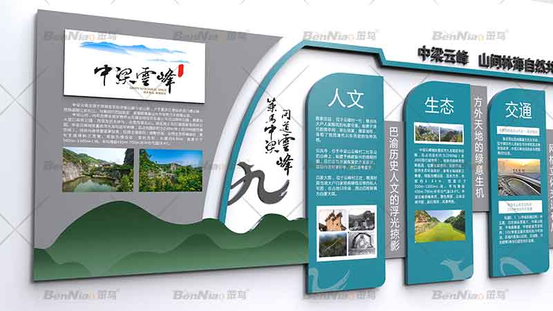 笨鳥文旅運用簡潔的框架、自然的背景和寫意的書法字,展現(xiàn)出了中梁云峰自然的藝術(shù)之美和文化的條理感,凸顯中梁云峰“山間林海自然共生”的生態(tài)文化。